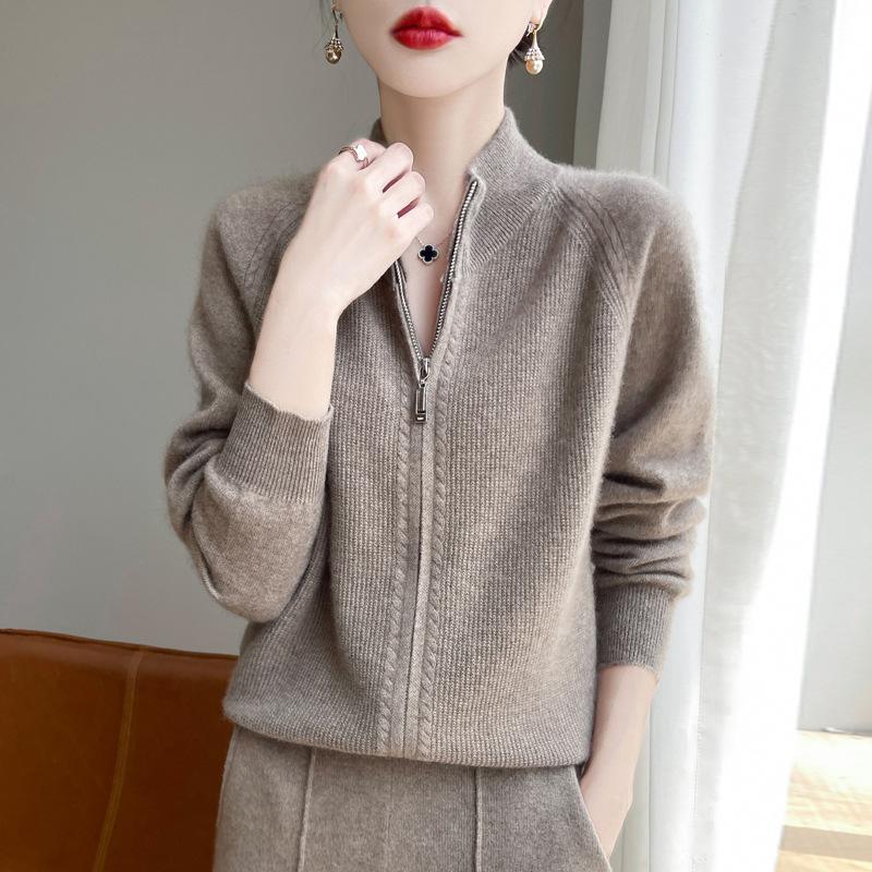 Кардиган шерстяной на молнии со стойкой для женщин Осень-Зима Новый стиль Свитер ингольчатой вязки Свободная куртка Повседневный вязаный топ