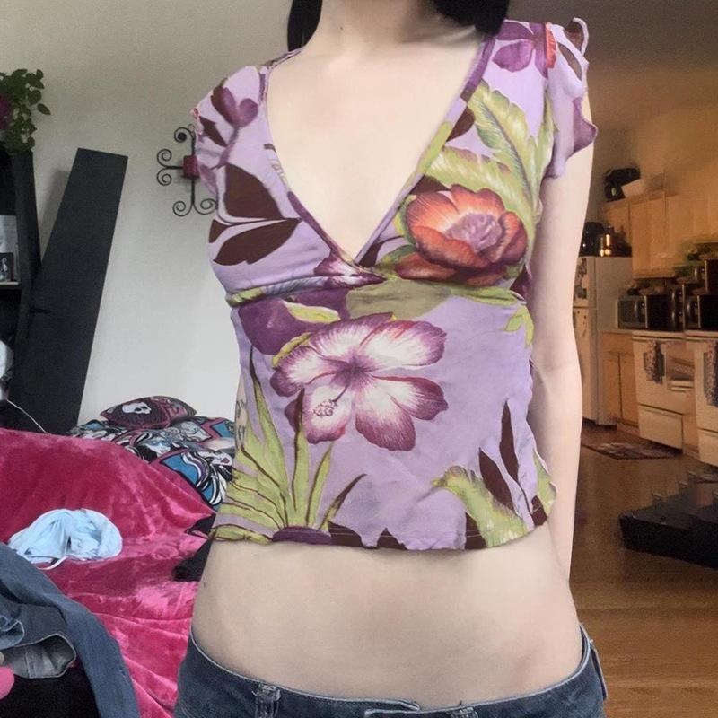 Топ Spice Girl с большим V-образным вырезом, рукавами-крылышками, цветочным принтом, фиолетовый, простая повседневная футболка с коротким рукавом