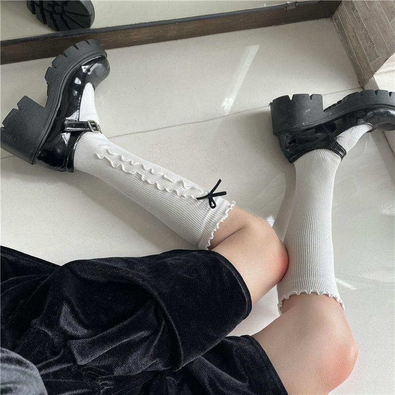 Носки до колена с бантом и кружевом в стиле милой японской Лолиты, однотонные хлопковые носки с оборкой «ушки» для женщин