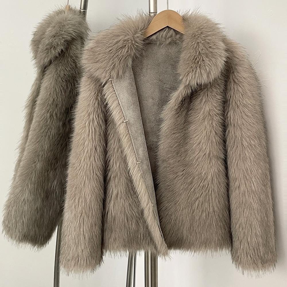 OFTBUY 2025 Зимнее женское пальто из искусственного лисьего меха, куртка средней длины с отложным воротником, пышный искусственный лисий мех, повседневный топ, верхняя одежда, приталенный однотонный уличный стиль