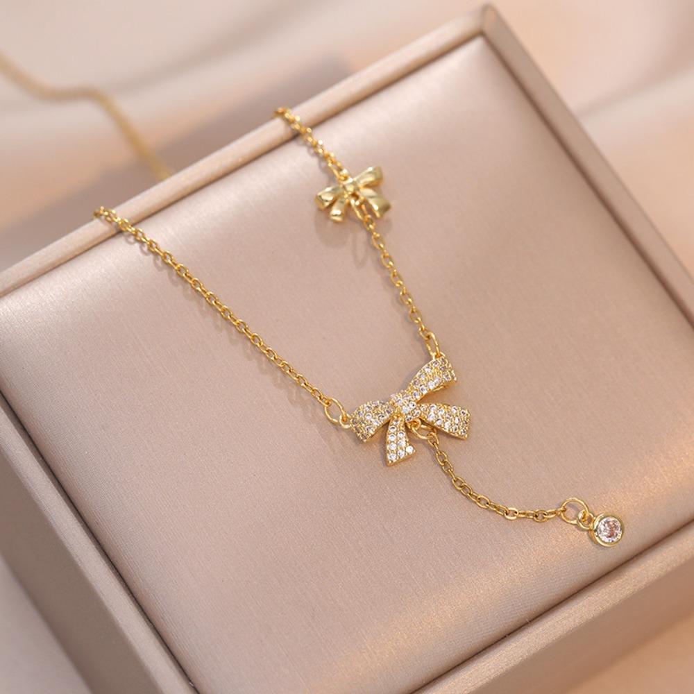 Изысканные ожерелья с длинной подвеской в виде бантика из циркона золотого цвета из нержавеющей стали для женщин, милые корейские колье, бижутерия в подарок, не тускнеют