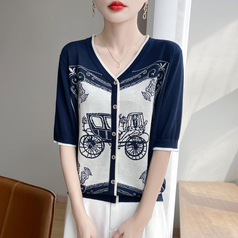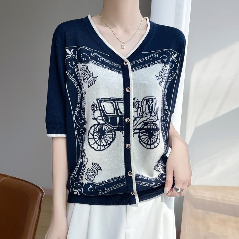 Ретро жаккардовая блузка, элегантное и молодежное пальто, летний новый трикотажный кардиган с короткими рукавами и V-образным вырезом для женщин