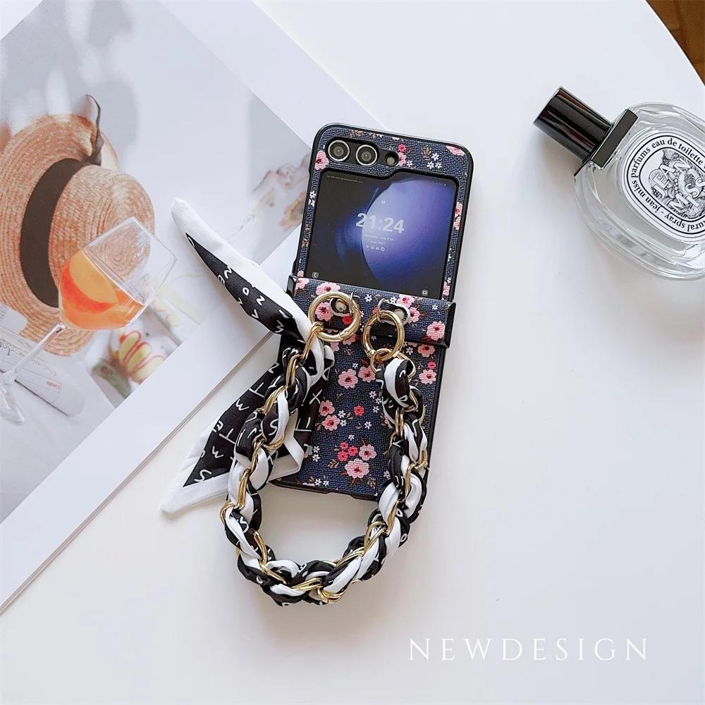 Цветочный чехол из ПУ кожи с защитой шарнира и ремешком-браслетом в виде шарфа-цепочки для запястья для телефона Samsung Galaxy Z Flip 6 5 4 3 5G