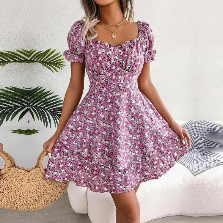Женское летнее платье с цветочным принтом, квадратным вырезом, короткими рукавами и шнуровкой, элегантный весенний наряд, размеры S-XL — купить товар онлайн с бесплатной доставкой до всему миру!