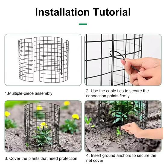 Настраиваемая клетка для растений: Создайте индивидуальную защиту для ваших растений, собрав сетку в различные формы, такие как цилиндры или прямоугольники, с помощью входящих в комплект стяжек и металлических колышков, что обеспечивает гибкость и простоту установки.