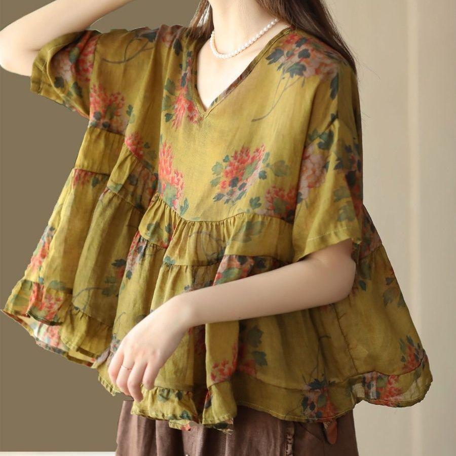 Весна Лето Новая Винтажный Принт Женская Рами Пуловер Рубашка с Элегантной Лоскутной Детской Рубашкой — купить товар онлайн с бесплатной доставкой по всему миру!