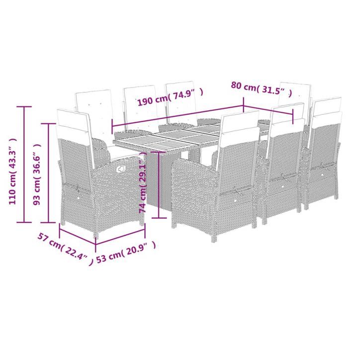 VidaXL Ensemble à Manger de Jardin avec Coussins 9 pcs, Table et Chaises avec Dossier et Repose-pied Réglables, 3212505