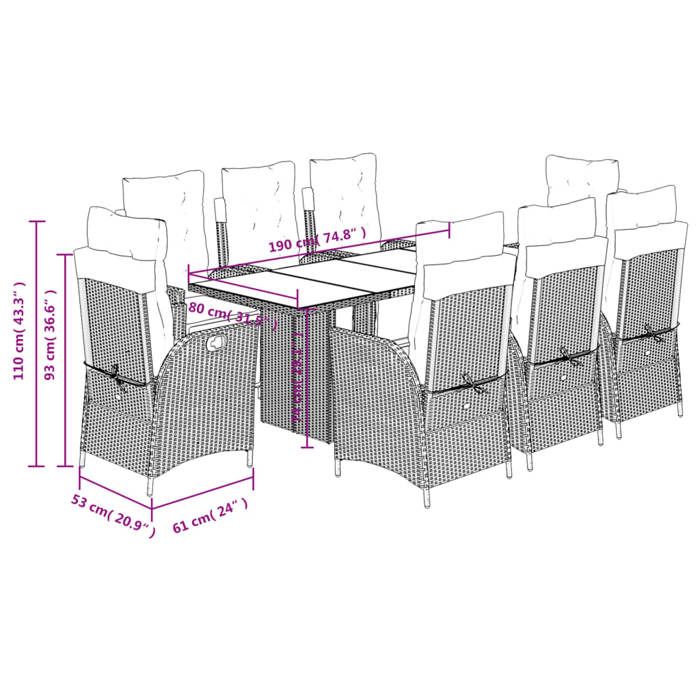 VidaXL Ensemble à Manger de Jardin avec Coussins 9 pcs, Table et Chaises avec Dossier Réglable, Meubles d'Extérieur, 3213353