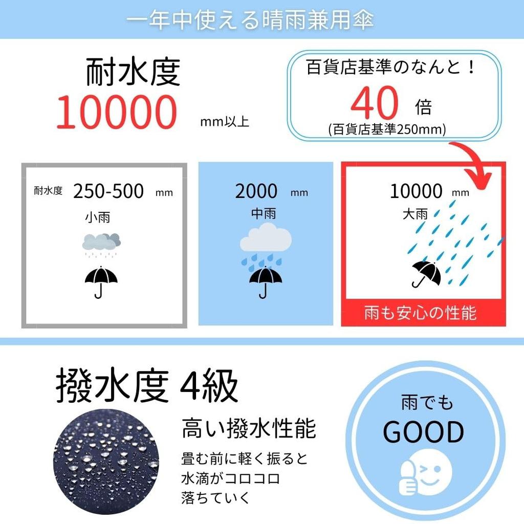 [Водостойкость/водоотталкивающие свойства] Водостойкость более 10 000 мм, что в 40 раз превышает стандарт универмага. (250 мм), вы можете быть уверены даже в сильный дождь. Кроме того, используемая ткань имеет водоотталкивающие свойства 4-го уровня, поэтому если ее слегка встряхнуть после использования, капли дождя скатятся, так что вы можете быть спокойны даже в переполненных поездах.