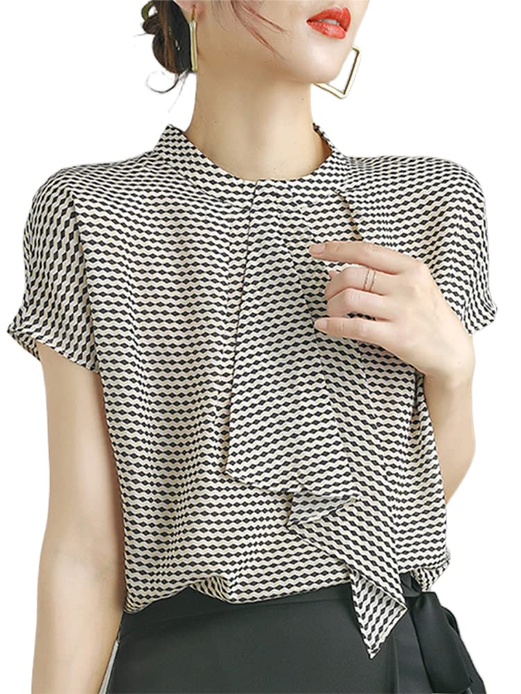 Блузка Летние топы Клетчатая рубашка Шифон Лента Топ с коротким рукавом Элегантный Взрослый Стройнящий Стильный Формальный Офисный OL Для поездок на работу Аккуратный [H. zroy] Женский