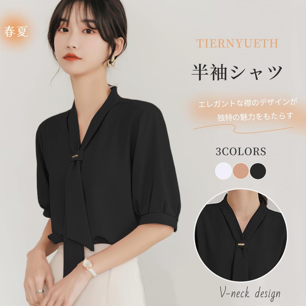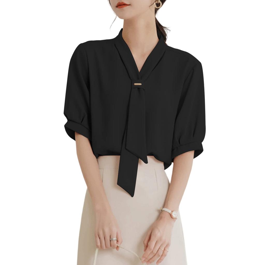 Блузка с коротким рукавом для офиса, пышная, облегающая, стильная [Tiernyueth] Женская, Рубашка, Топ, Шифон, Рукав, V-образный вырез, Сшивная, Закрывающая, Облегающая, Модная, Весна,