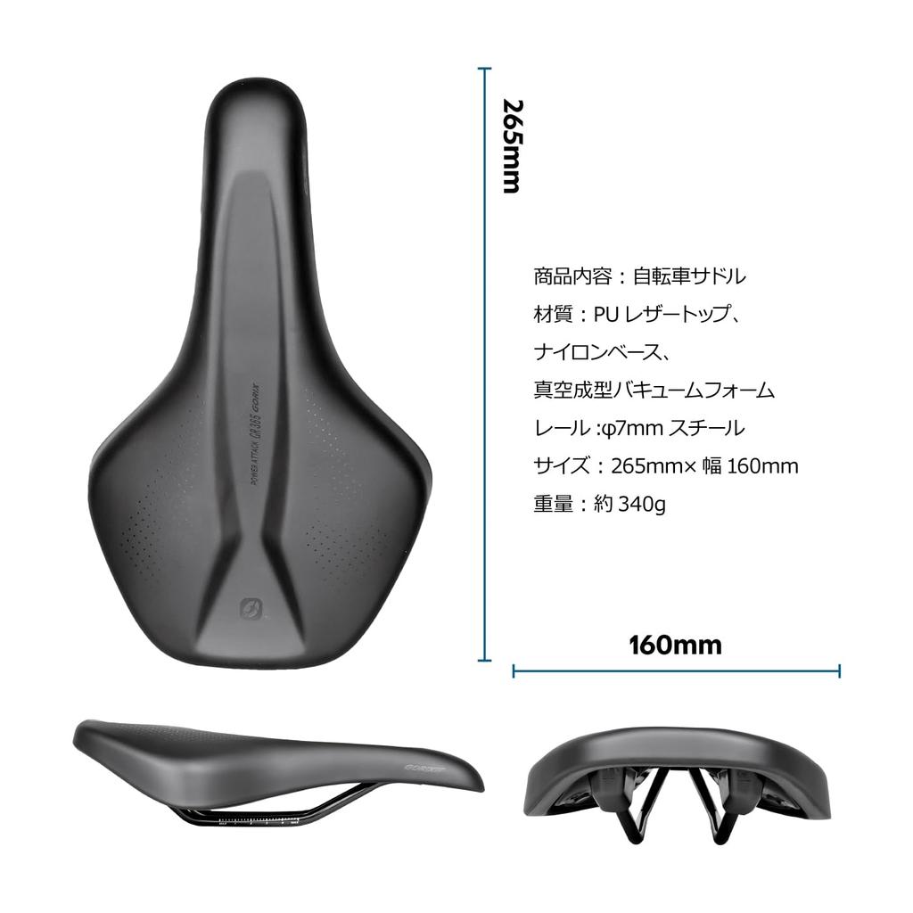 [Содержимое продукта] Велосипедное седло [Материалы] Верх из ПУ кожи, нейлоновая основа, вакуумно-формованный вакуумный пеноматериал [Рамки] 7мм стальные рамки [Размер] 265 x ширина 160мм [Вес] Примерно 340г