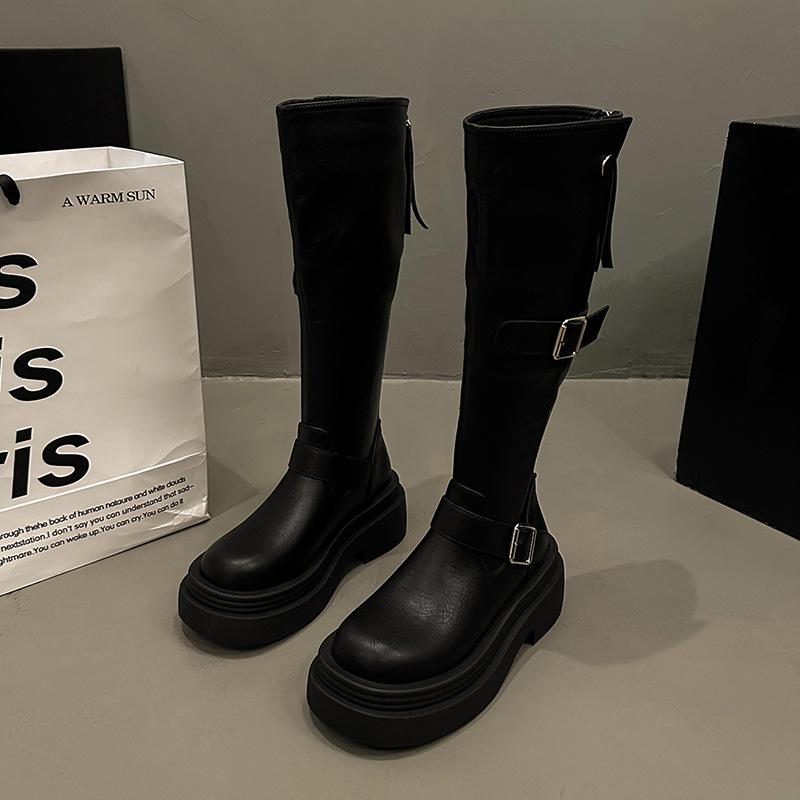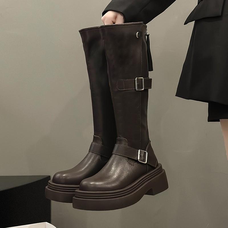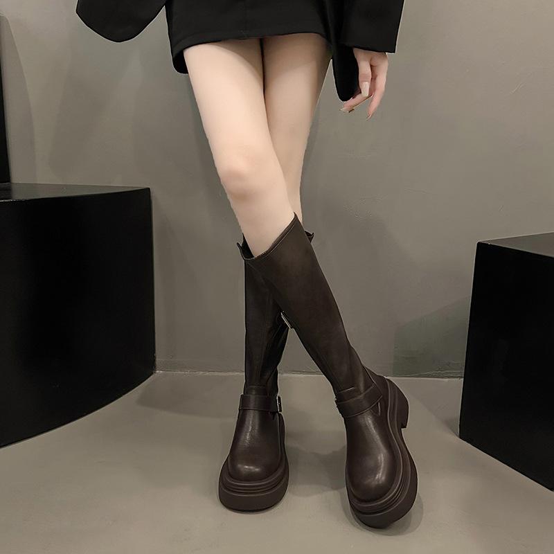 Пряжка на ремне Толстая подошва Квадратный каблук Женские короткие ботинки Осень и Зима Ретро Высокие ботинки Маффин Обтягивающие Spice Girl Мотоциклетные ботинки