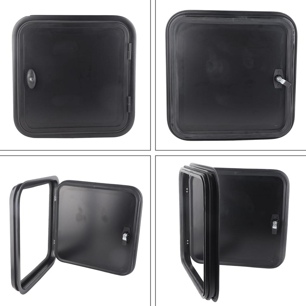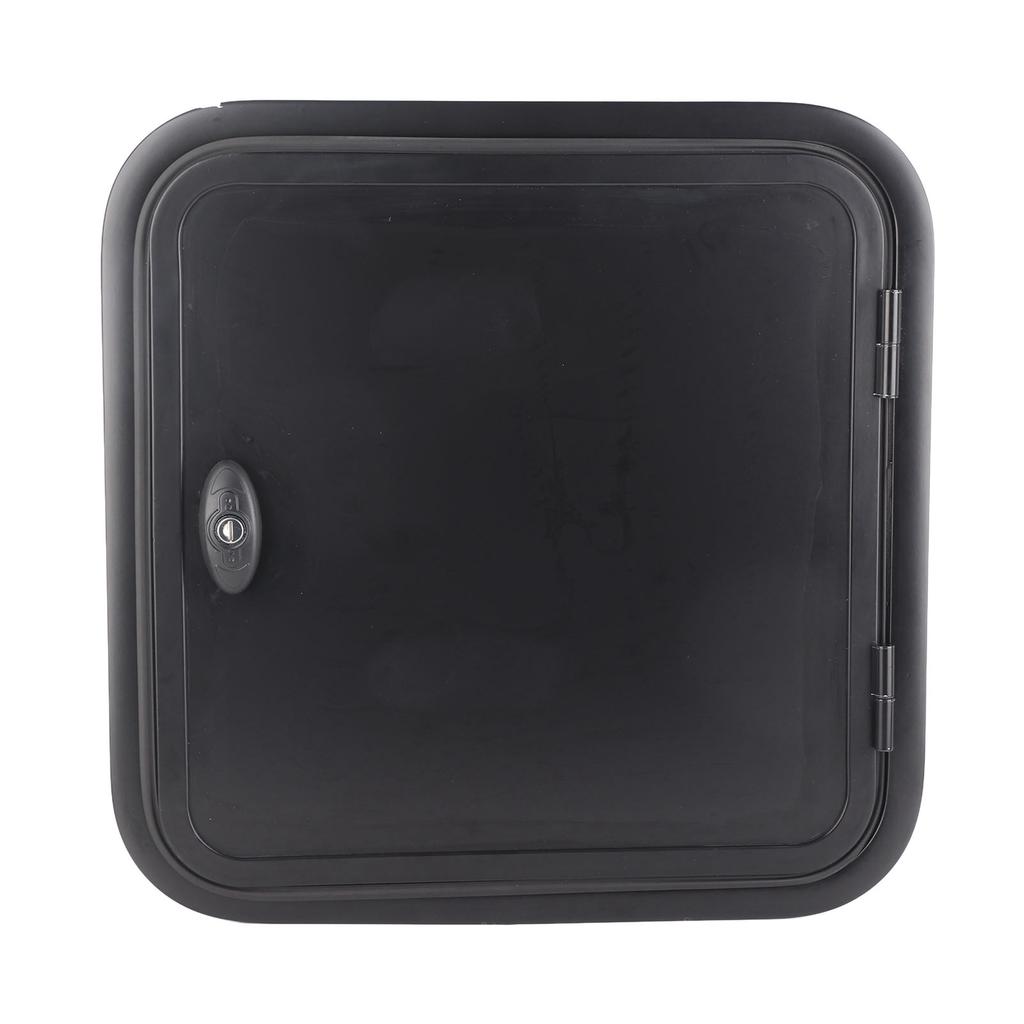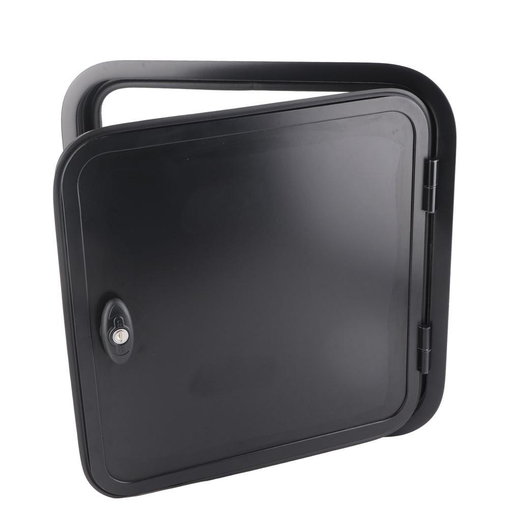 5. заявка: Черная квадратная дверь доступа для хранения со скругленными углами, подходящая для автодомов, кемперов, прицепов, автокараванов и т. д.. любая необходимость в положении двери отсека.