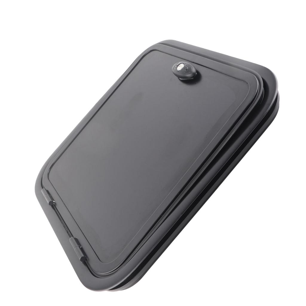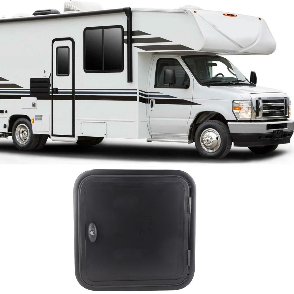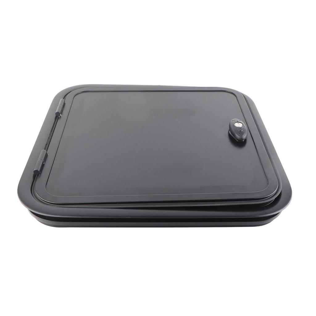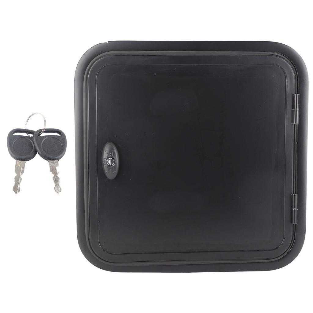 5. заявка: Черная квадратная дверь доступа для хранения со скругленными углами, подходящая для автодомов, кемперов, прицепов, автокараванов и т. д.. любая необходимость в положении двери отсека.