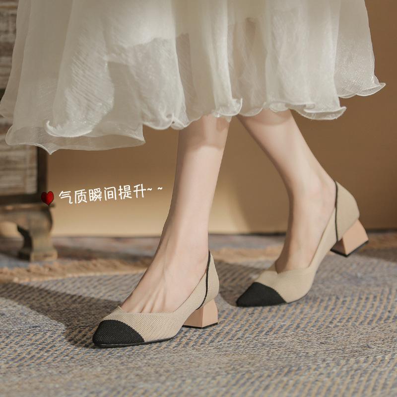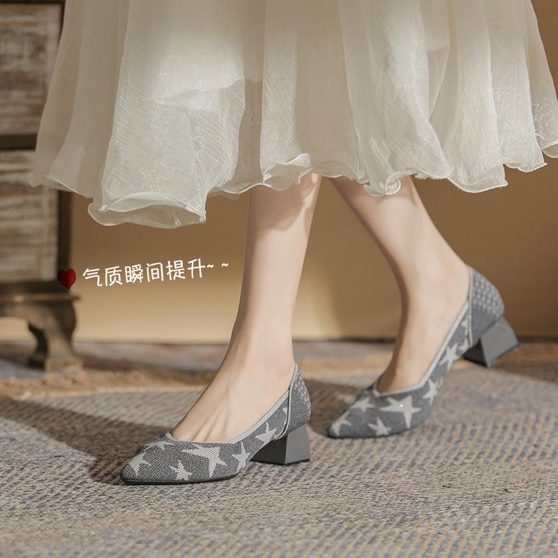 Летающие тканые туфли-одинарки женские средний каблук высокий каблук универсальные дышащие мягкая подошва толстый каблук острый носок весна и осень вязаные