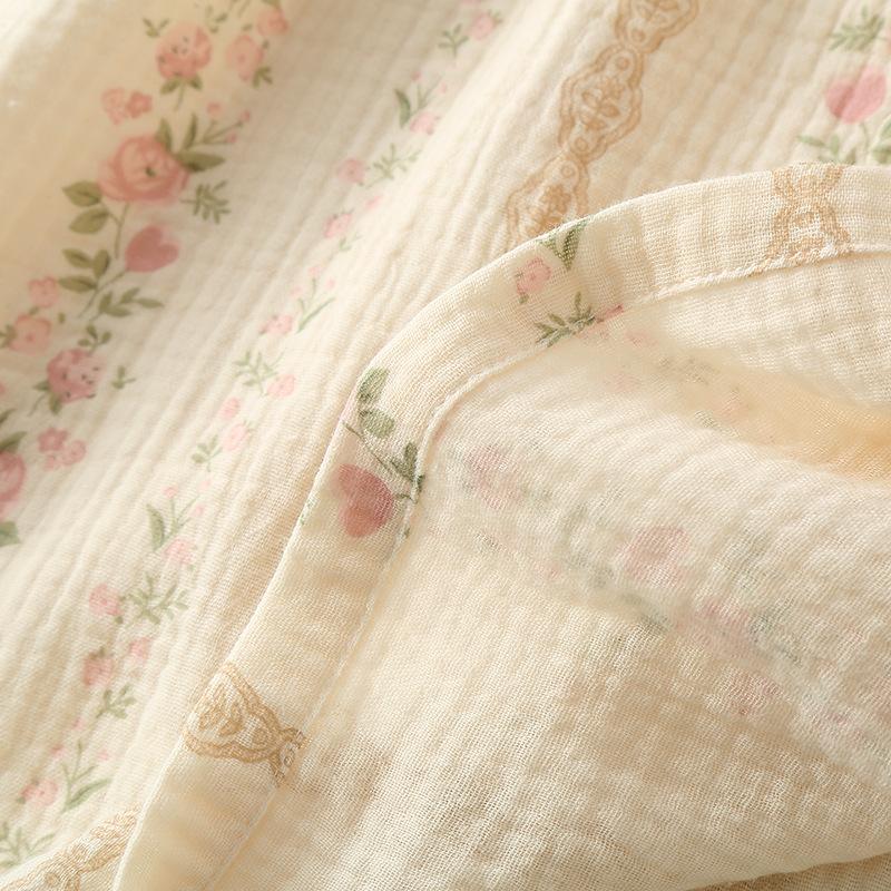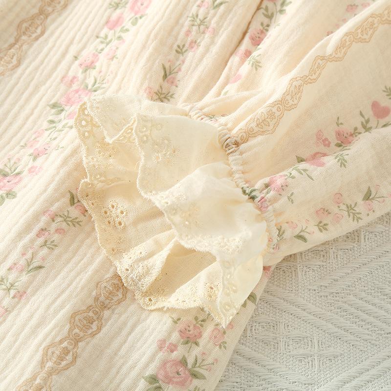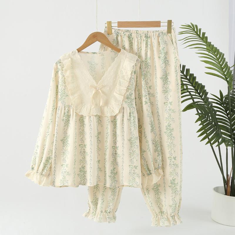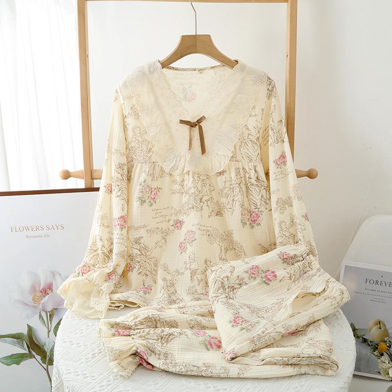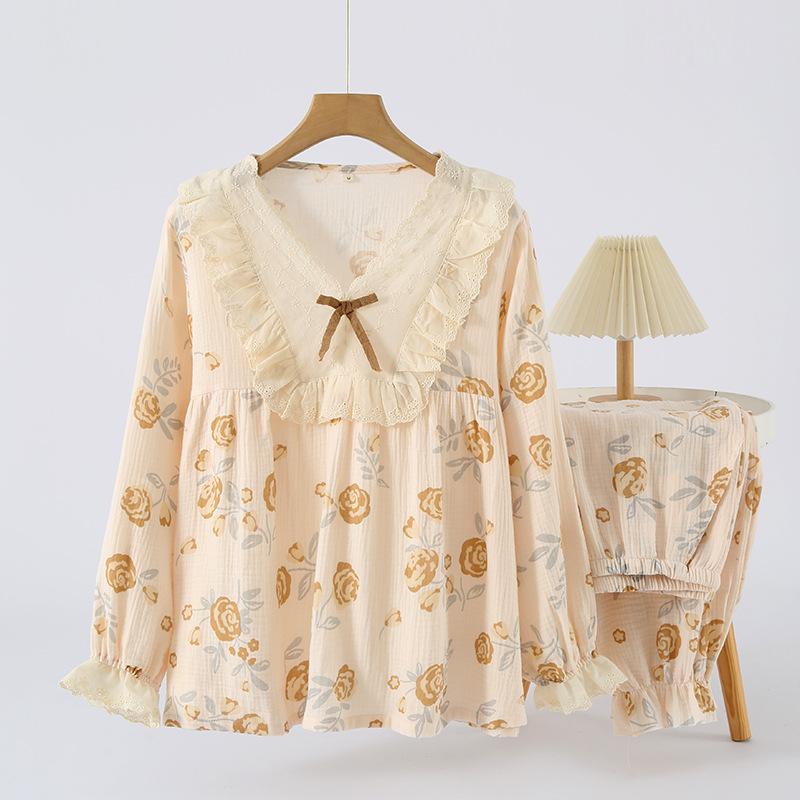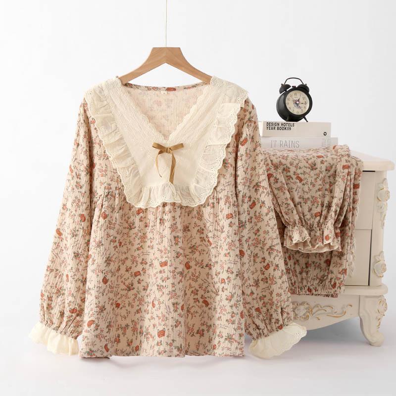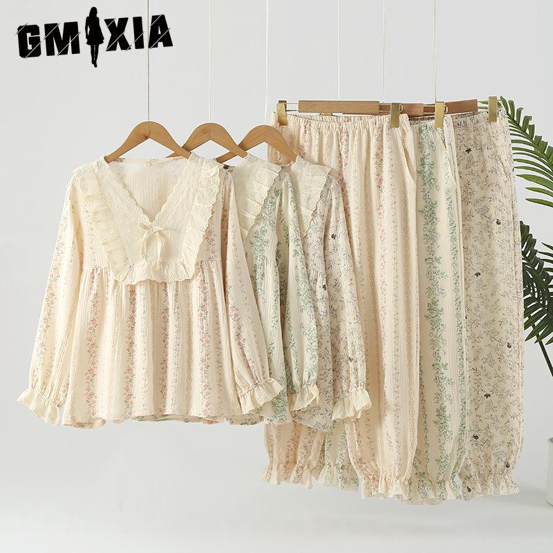 GMXIA Нежный женский цветочный комплект из чистого хлопка, свободный, двухслойная марля, домашняя одежда, пижамный набор для осени, с длинными рукавами, для ношения на улице, пижамные наборы