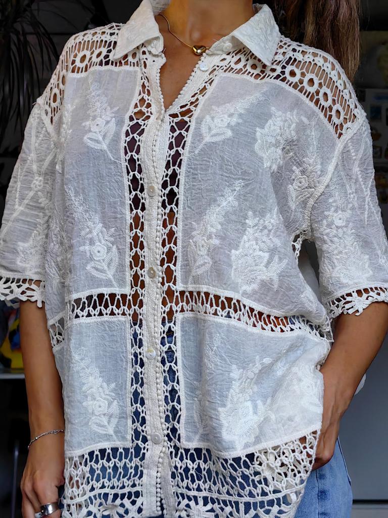 Dimanaf 2025 Новая летняя рубашка на пуговицах Женская кружевная блузка Вышивка Короткий рукав Модные топы Футболки Повседневные свободные футболки
