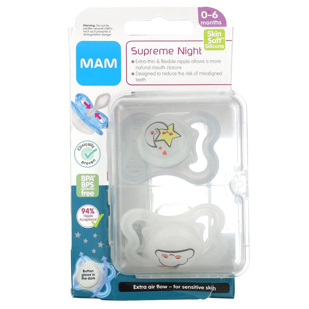 Описание товара : Skin Soft™ СиликонКлинически доказаноНе содержит BPA° BPS94% Принятие соски¹Кнопка светится в темнотеДополнительный поток воздуха - Для чувствительной кожиНаграда за безопасность продукции 2019 - Специальное упоминаниеКоробка-стерилизатор 3 мин - 750-1000 ВтДезинфицируется за 3 минуты - до 48 часовЭкстра-тонкая и гибкая соска обеспечивает более естественное закрытие рта. Разработано для снижения риска неправильного прикуса.Уникальная соска позволяет рту ребенка закрываться более естественно.Сверхтонкая форма шейки соски MAM Supreme позволяет рту ребенка закрываться в более естественном положении.Это дает зубам место, необходимое для нормального роста, и снижает риск неправильного прикуса.Клинически доказано: Долгосрочное исследование подтверждает, что соска MAM Perfect, используемая в пустышке MAM Supreme, минимизирует риск неправильного прикуса по сравнению с обычной пустышкой.. (Клиническое исследование: Германия, 2016, n=86.)Соска с силиконовой поверхностью SkinSoft™ кажется знакомой младенцам. Бокс-стерилизатор для микроволновой печи MAM доказано эффективен в уничтожении распространенных бытовых микробов и бактерий. Инновация: Уникальная симметричная соска MAM на 60% тоньше и в 4 раза гибче².1Исследование рынка 2010-2018 гг., протестировано на 1383 младенцах. Продукт соответствует требованиям EN 1400. Инструкции внутри. 2 научных отчета от института Wild Hi-Precision подтверждают: Соска MAM Perfect, используемая для MAM Supreme, в среднем на 60% тоньше; серия тестов Клиники стоматологии Венского университета подтверждает: он также в среднем в 4 раза более гибкий, чем сопоставимые пустышки. (между: на 32% - 83% тоньше/в 1,1 - 19,5 раз гибче обычных силиконовых пустышек). ºНе содержит БФА/БФС: Все продукты MAM изготовлены из материалов, не содержащих BPA и BPS.