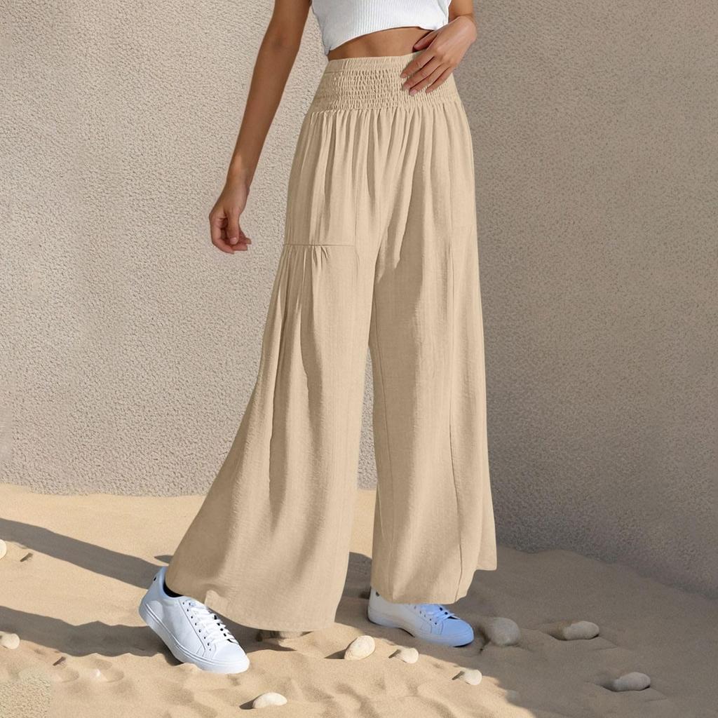 Льняные повседневные брюки с широкими штанинами для женщин, эластичная талия, универсальные, деловой кэжуал, рабочие брюки палаццо с карманами