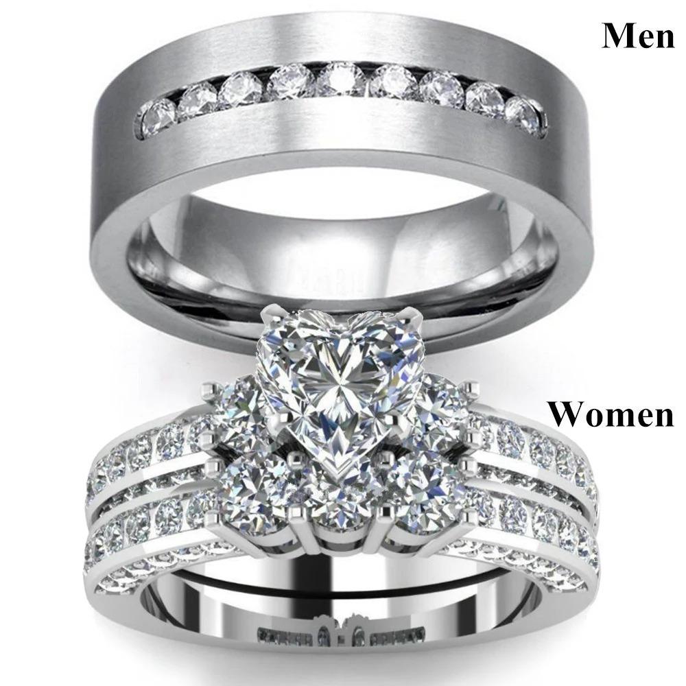 Парные кольца для женщин с сердечками и стразами, набор колец с цирконием, простое кольцо из нержавеющей стали с кубическим цирконием для мужчин, свадебные украшения в подарок для любимых