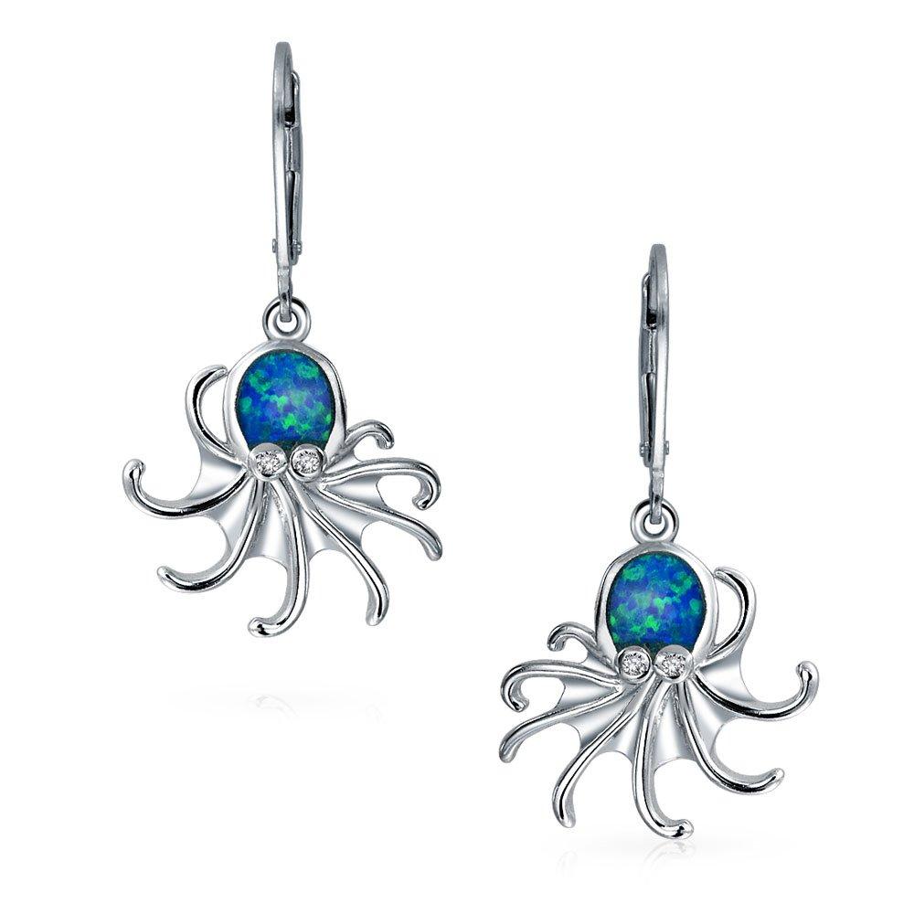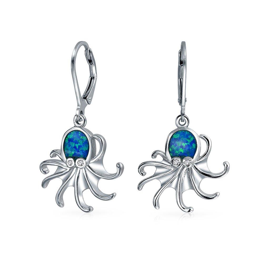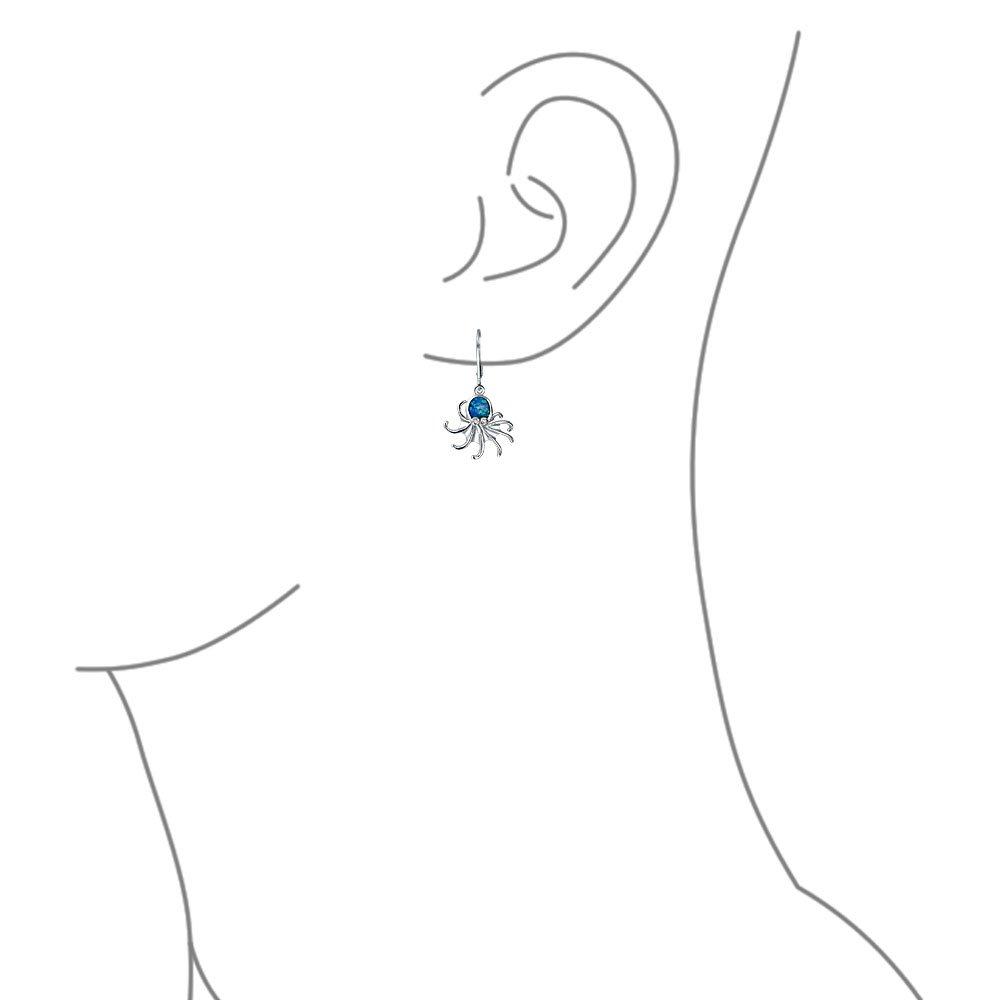 Nautical Blue Simulated Opal Marine Life Leverback Octopus Dangle Earrings for Teens and Women in Sterling Silver .925
