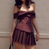 Женский уличный костюм из двух частей с открытыми плечами, двубортный, приталенного кроя, блузка с воротником и мини-плиссированная юбка — купить товар онлайн с бесплатной доставкой по всему миру!