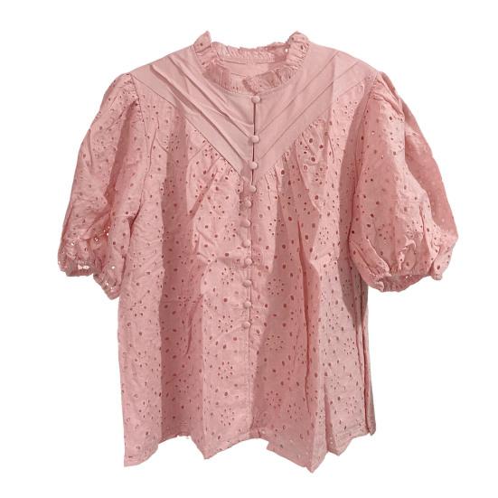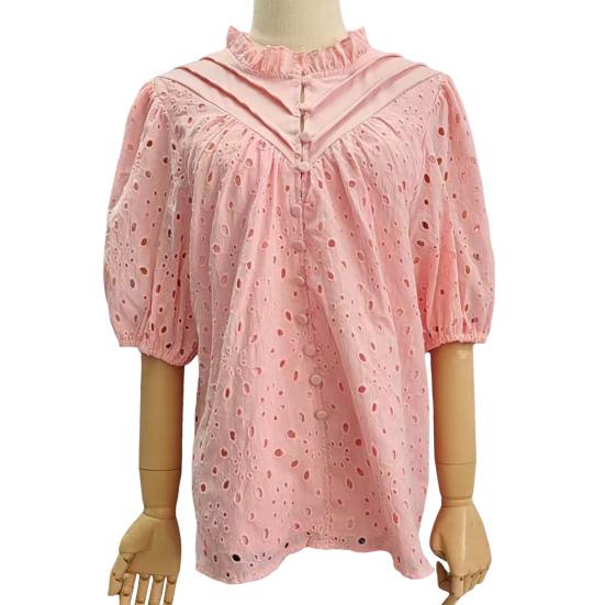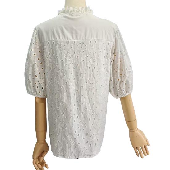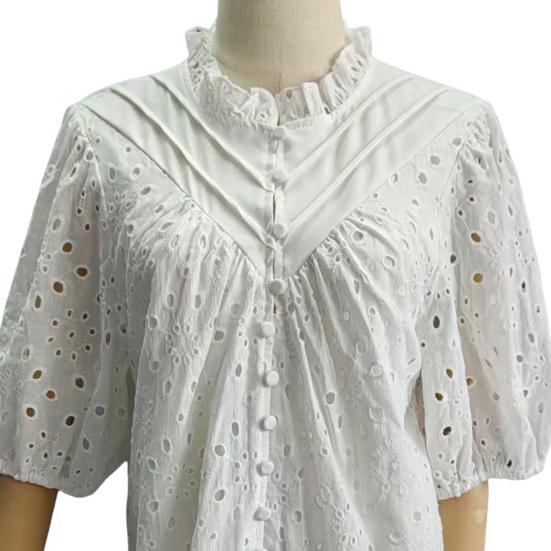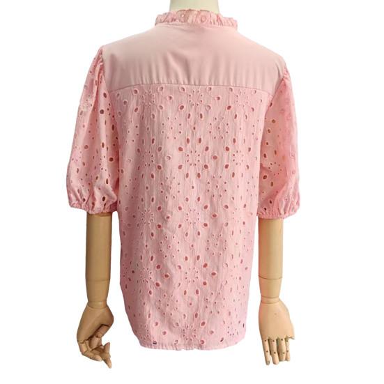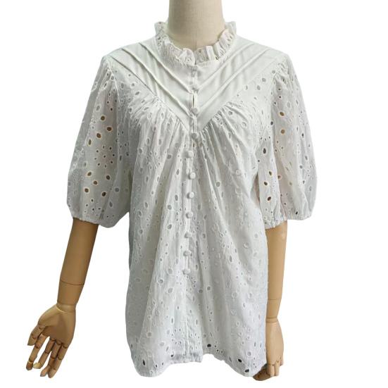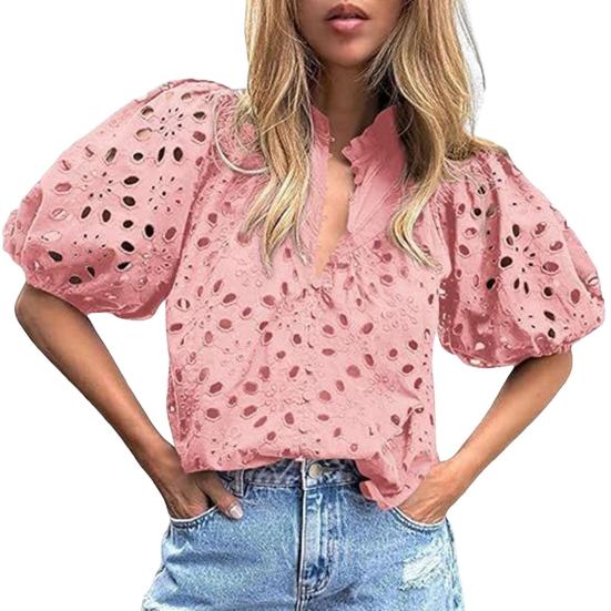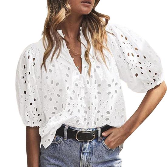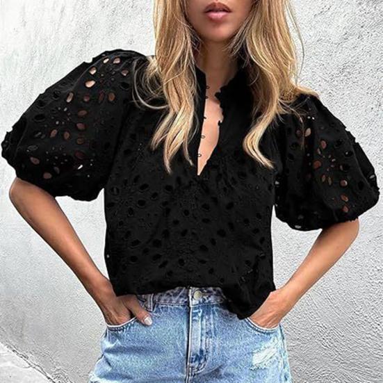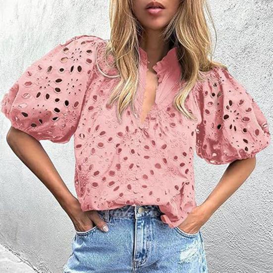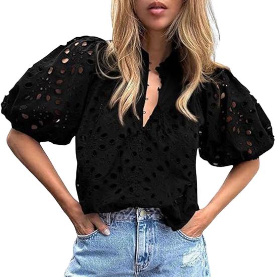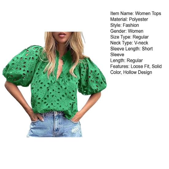 Женские топы V-образный вырез пышные короткие рукава ажурная вязаная крючком рубашка однотонная свободного кроя