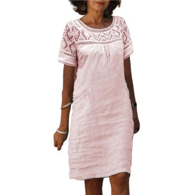 Это женское платье изготовлено из хлопкового льна и имеет свободный покрой для максимального комфорта.. Мягкая и легкая ткань обеспечивает ощущение уюта, которое вам не захочется снимать.. Это платье с круглым вырезом и однотонным дизайном с кружевными вставками воплощает классическую элегантность и универсальность..