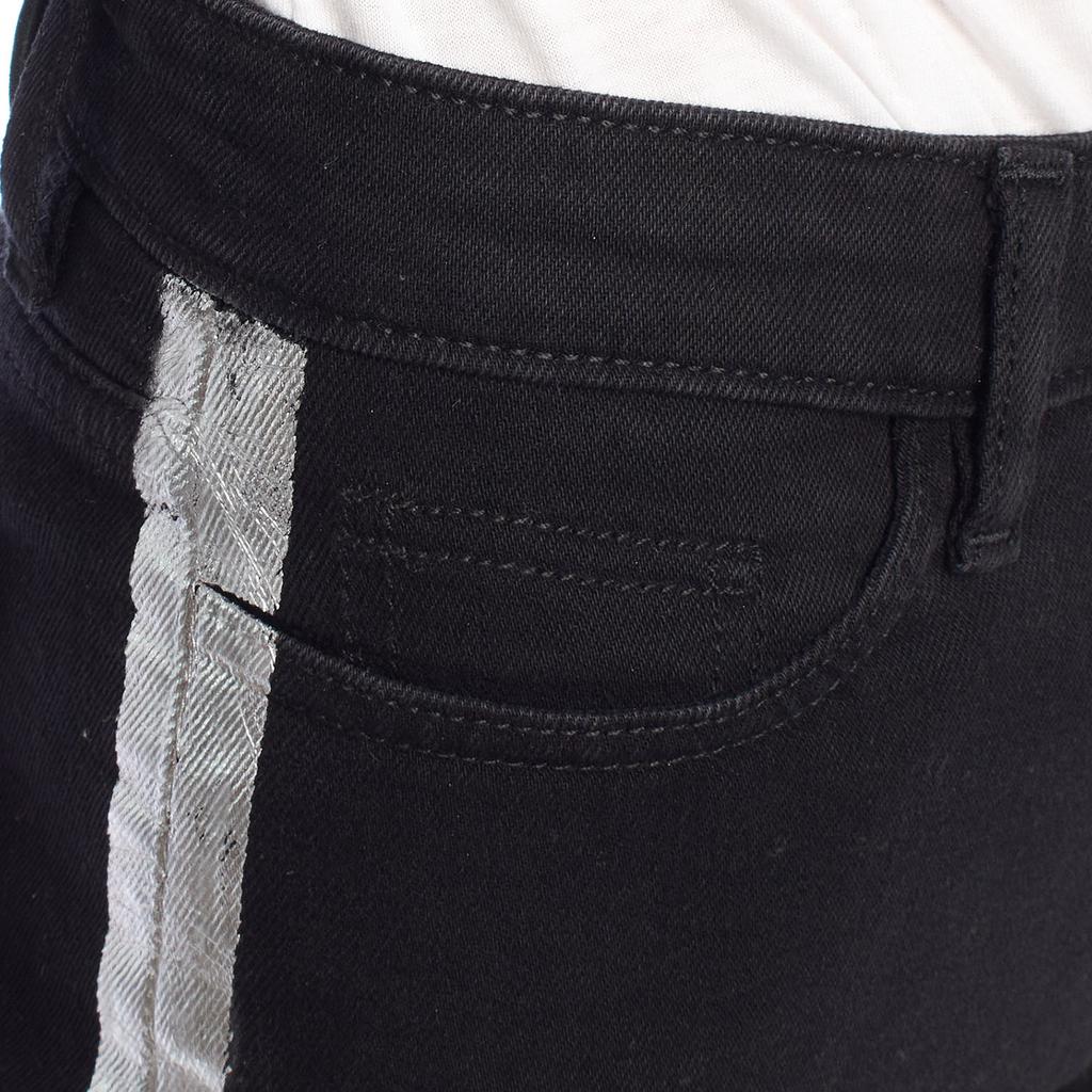 Джинсы с металлизированной боковой полосой и рваным низом.