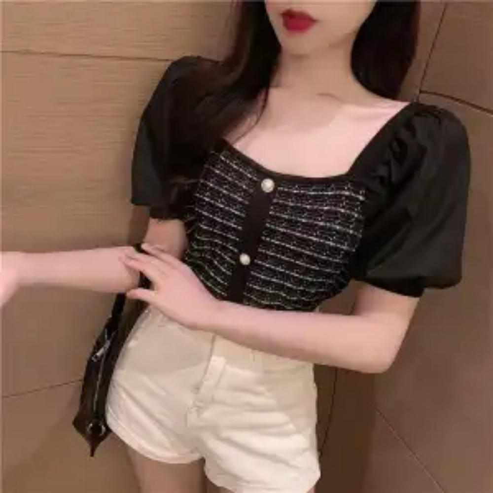Топ женский трикотажный с короткими рукавами-буфами, комбинированный, из ледяного шелка, облегающий, с квадратным вырезом, нового стиля