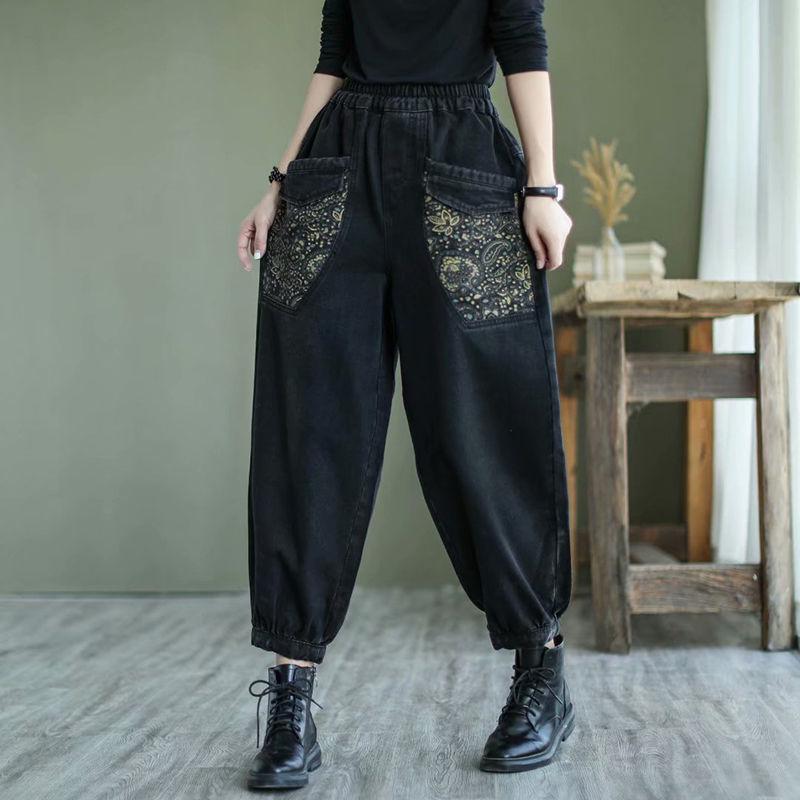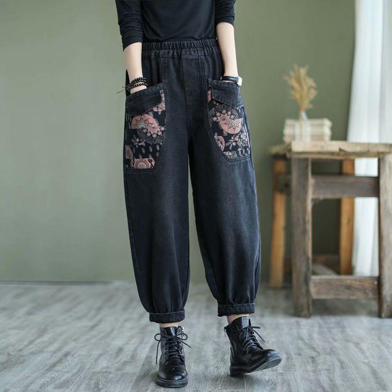 Женские осенние ретро джинсы из денима свободного кроя больших размеров с карманами и принтом, брюки-фонарики, модные джинсовые брюки гаремы