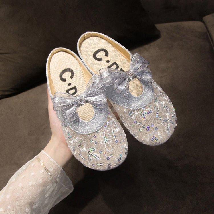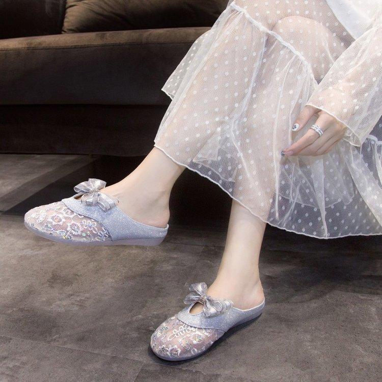 Summer new lace bow mesh cool slippers women's versatile flat-bottomed bag head lazy half slippers