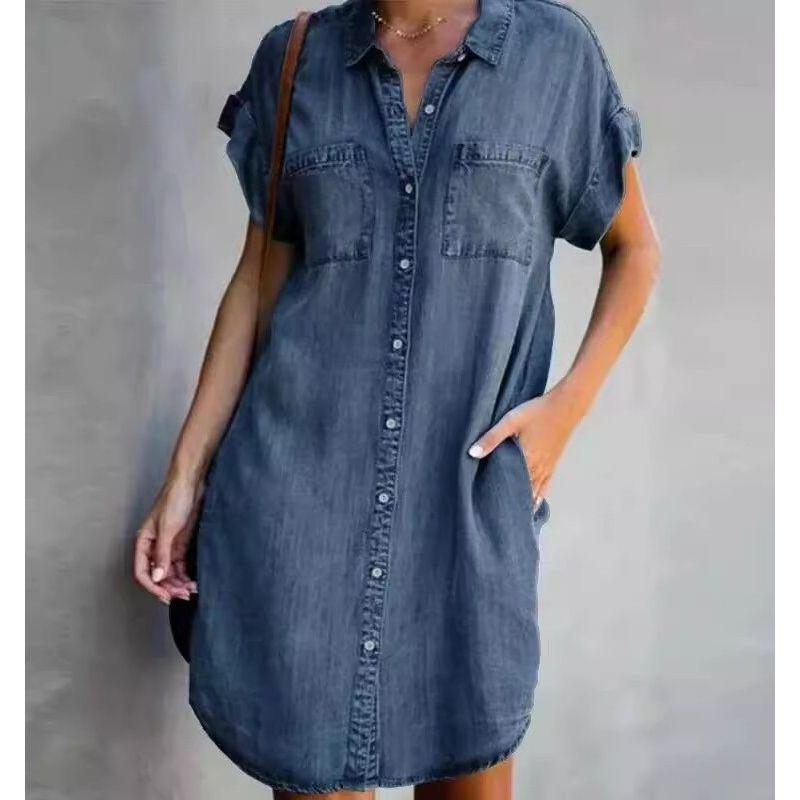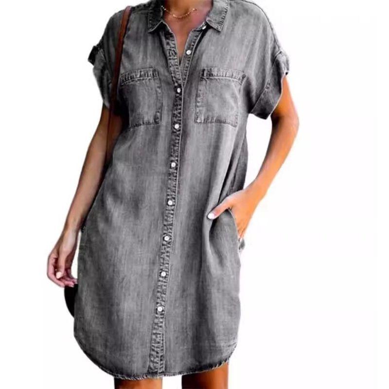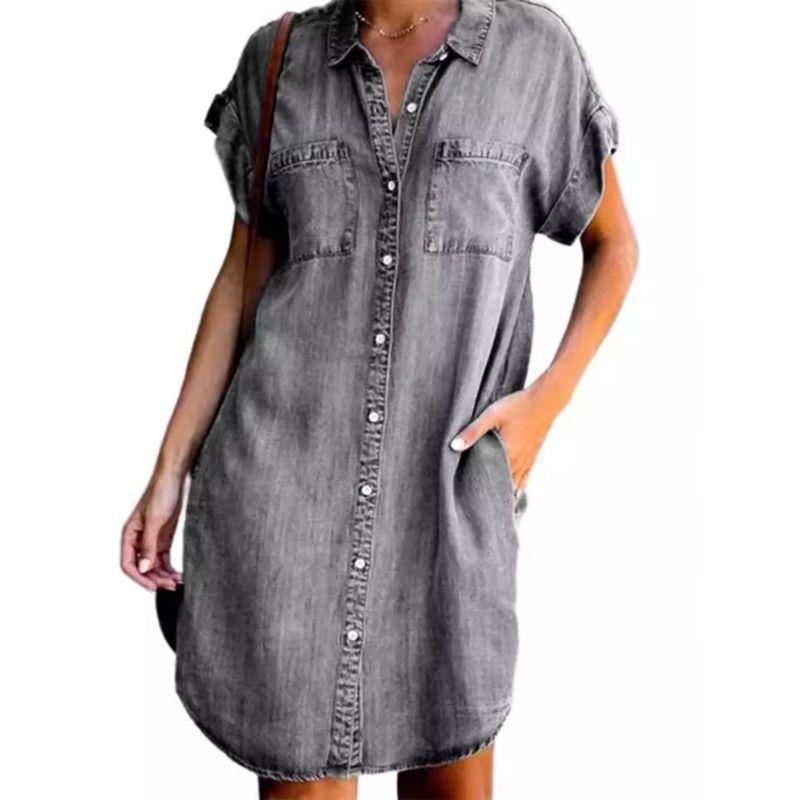 Женское приталенное платье однобортное джинсовое с коротким рукавом