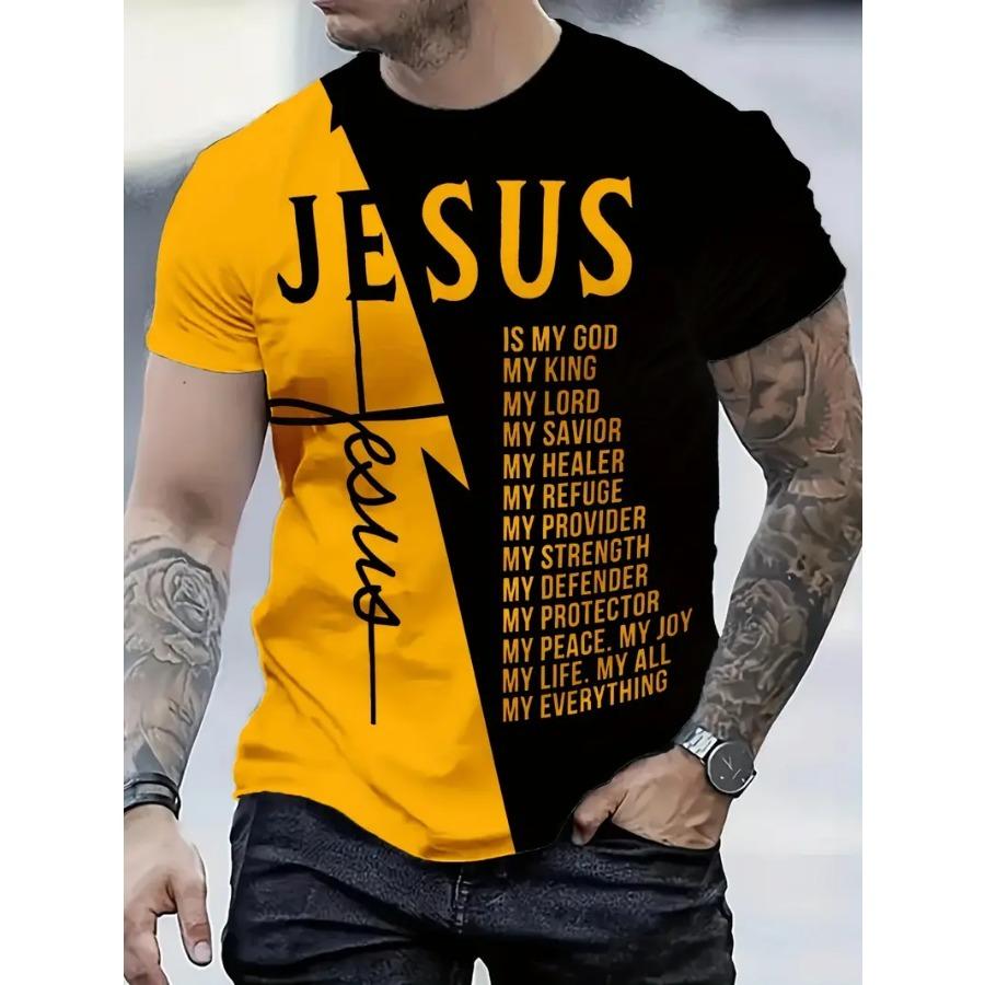 Мужская стильная черно-синяя футболка с 3D-принтом креста и текстом - Иисус - мой Бог - Удобный короткий рукав, круглый вырез — купить товар онлайн с бесплатной доставкой по всему миру!