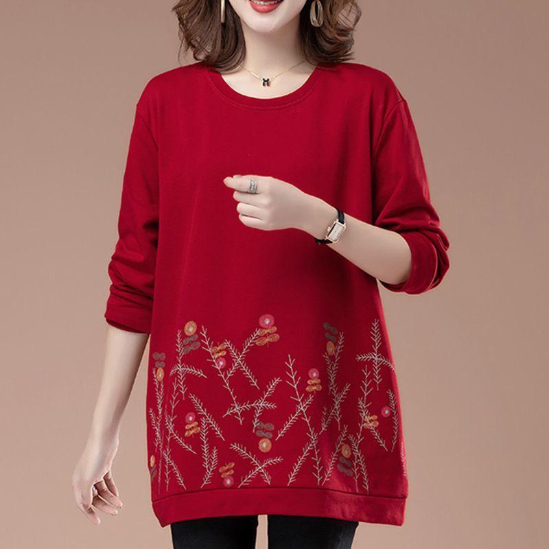 Женская футболка с круглым вырезом большого размера Осень и Зима Новая Свободная Миди с длинным рукавом Принт Карман Фолк Повседневная Толстовки Топы