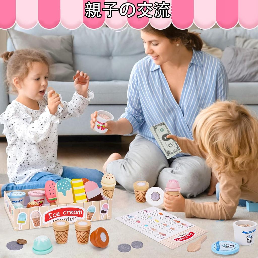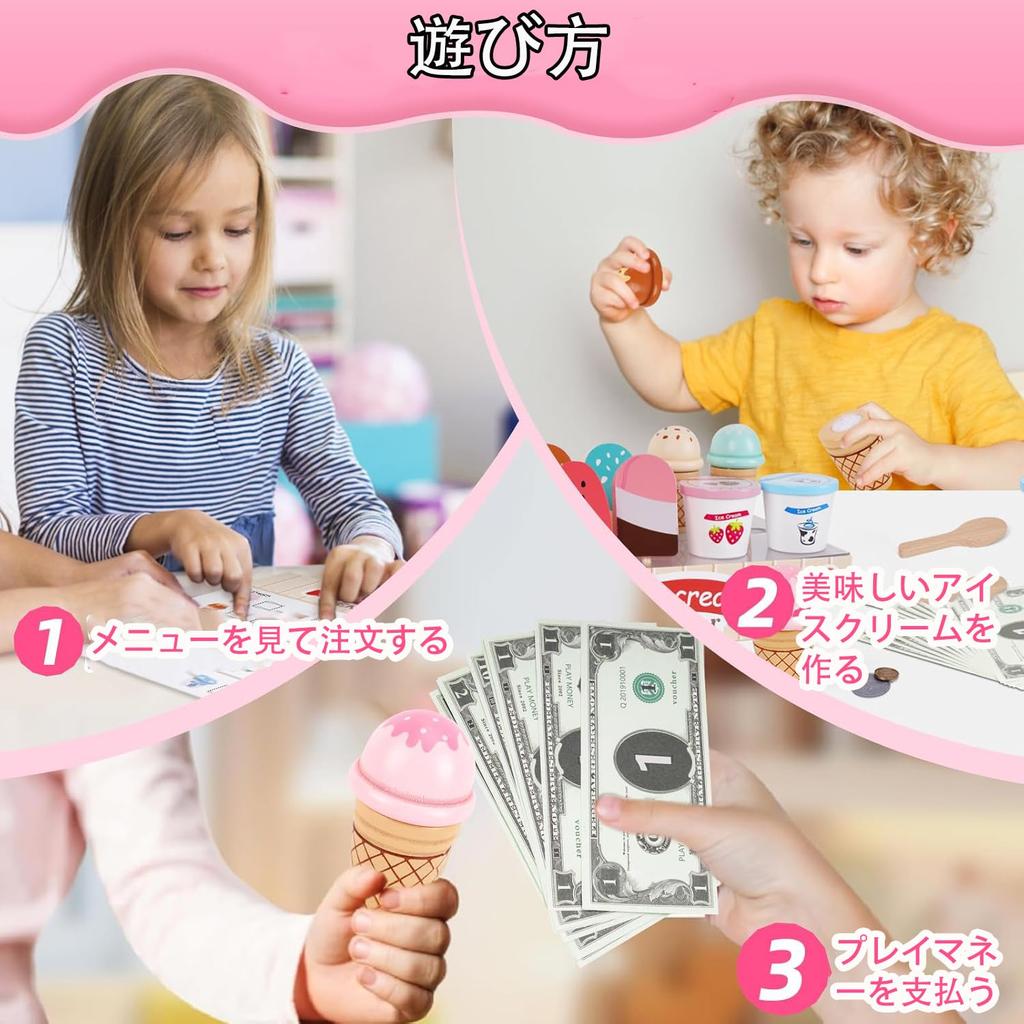 【Веселье и обучение через ролевую игру】Этот деревянный игровой набор включает в себя все необходимое для управления магазином мороженого. Ваш ребенок может имитировать реальные жизненные ситуации, такие как прием заказов, заказ еды, оплата карманными деньгами и подача еды, как будто он находится в своем любимом ресторане.. Это помогает улучшить мелкую моторику, ловкость, координацию рук и глаз, распознавание цветов и силу хвата, помогая им стать более независимыми во время еды.
