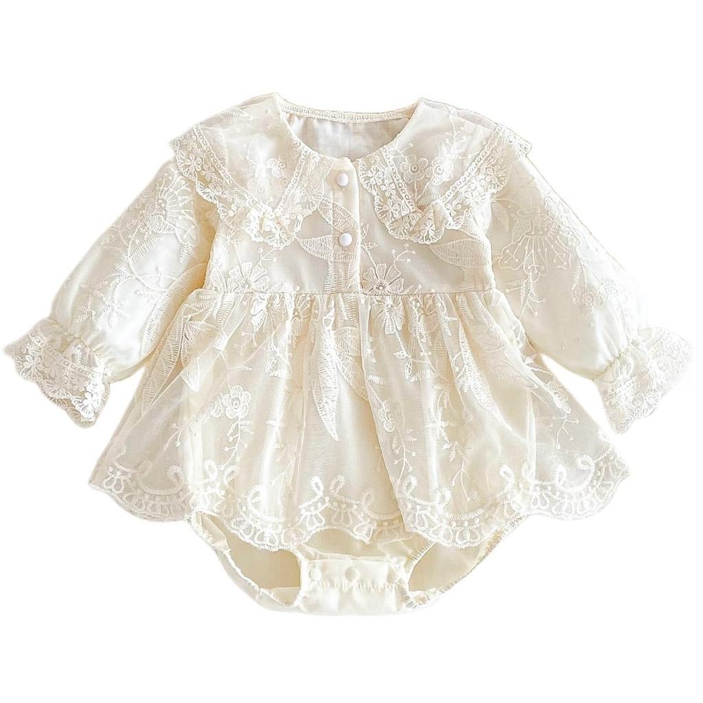 [Элегантные и милые детские ромперы в стиле принцессы]: Элегантный и милый детский комбинезон с нежной цветочной кружевной вышивкой, который делает его похожим на принцессу.. Спокойный цвет слоновой кости делает его идеальным для особых случаев, таких как посещение святынь, дни рождения, свадьбы и памятные фотосессии.