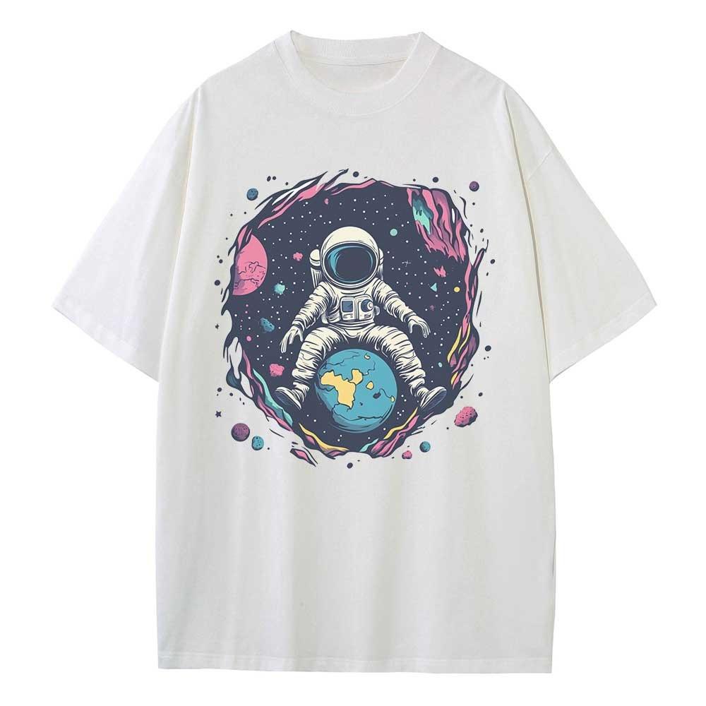 Свободная футболка Хлопковая футболка с рисунком Дизайнерская одежда Космос Земля Астронавт Со спущенным плечом Винтажный Нейтральный топ Универсальная футболка