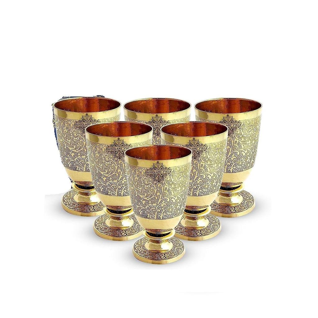 Стакан из чистой латуни с дизайном кубка - 350 мл, с тиснением, Питьевая и сервировочная вода, йога и аюрведа, 6 предметов