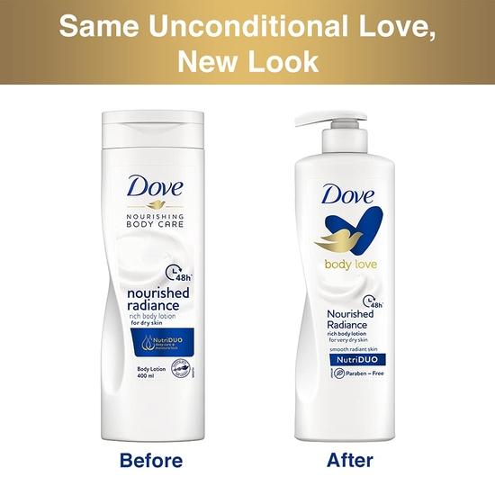 DOVE Body Love Питательное сияние лосьон для тела для очень сухой кожи 48 часов увлажнения без парабенов с увлажняющим компонентом на растительной основе мягкая сияющая кожа 400 мл