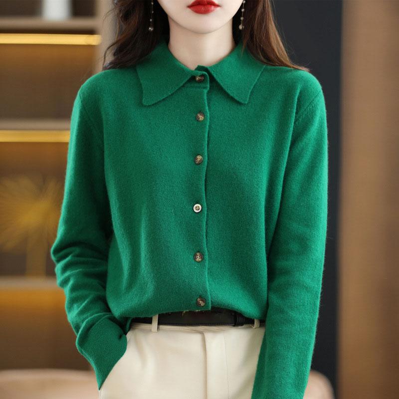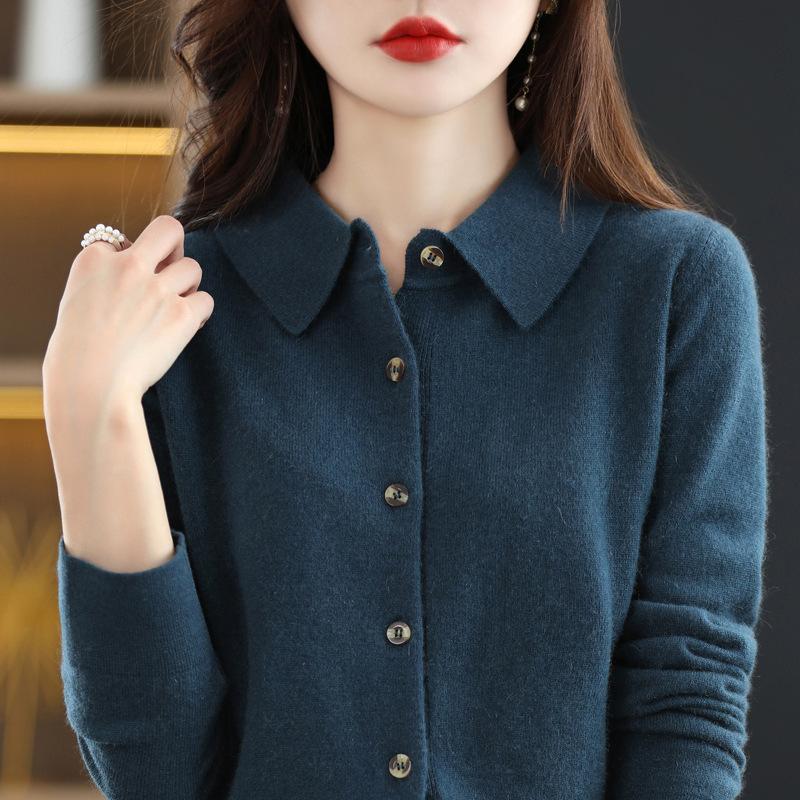 Весна и осень зима шерстяная трикотажная рубашка с воротником поло и свободным длинным рукавом свитер кардиган темперамент лацкан пальто низ