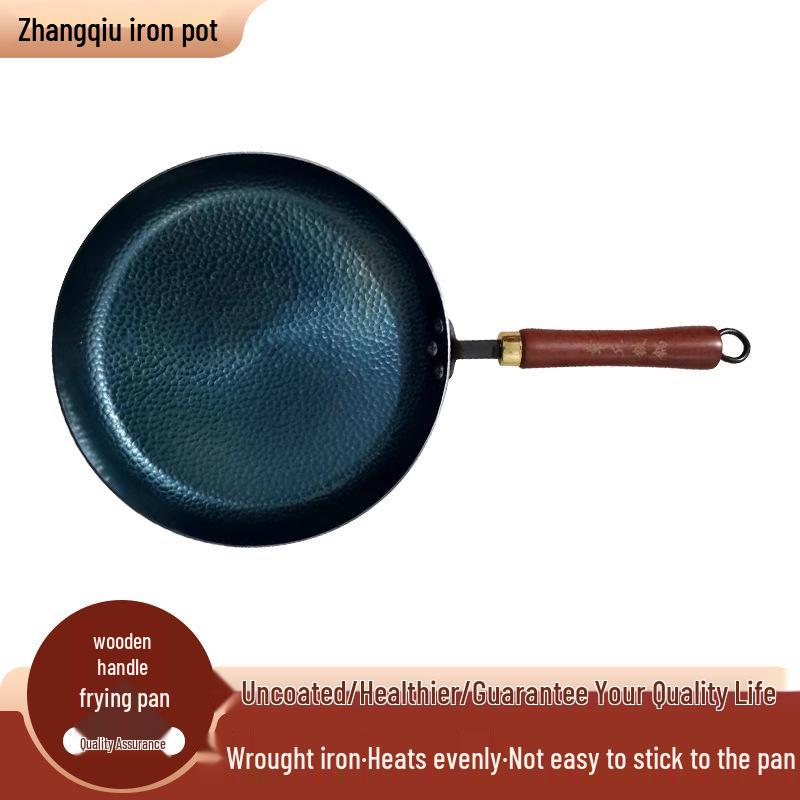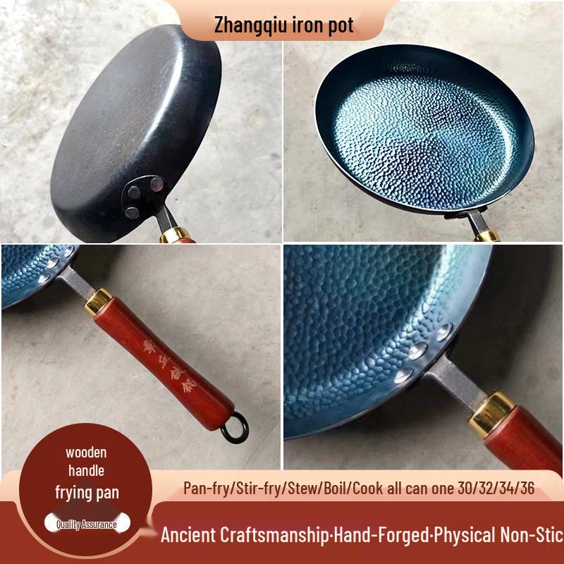 Кованый вручную чугунный вок с плоским дном и антипригарным покрытием, с деревянной ручкой