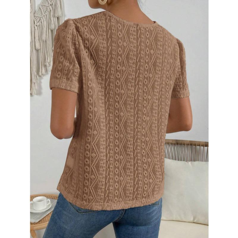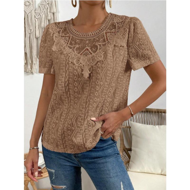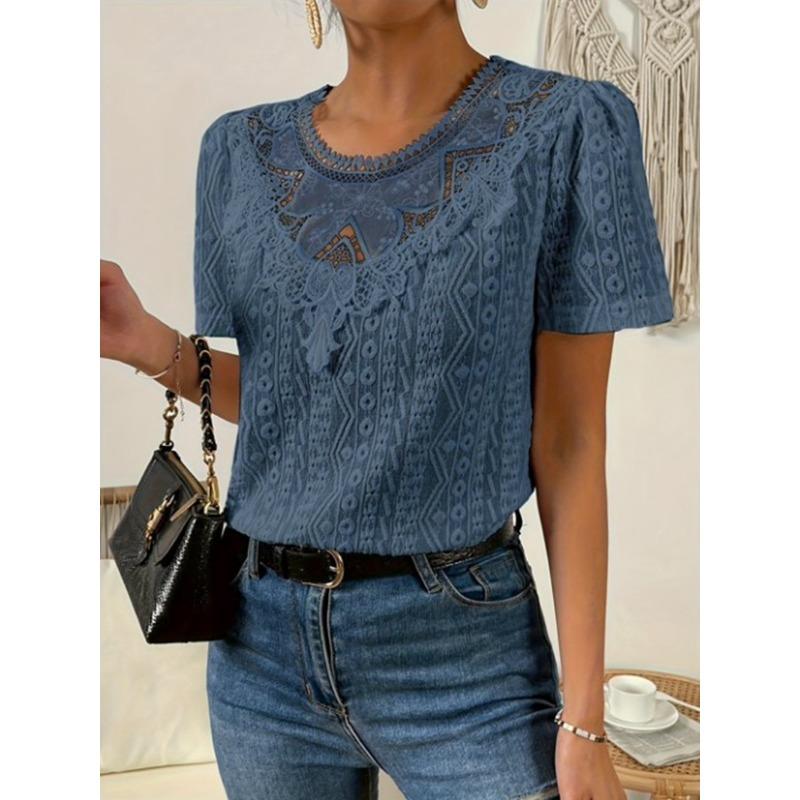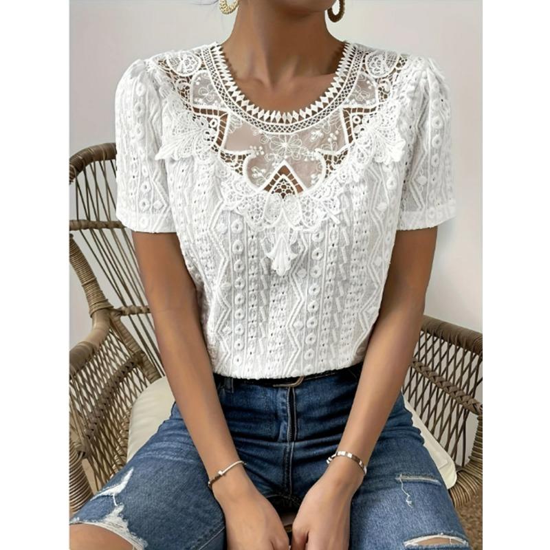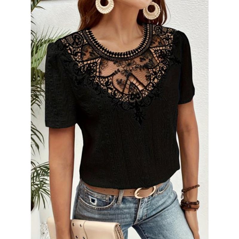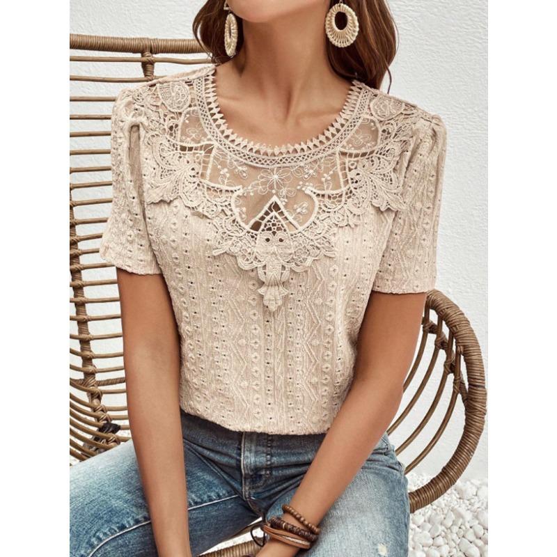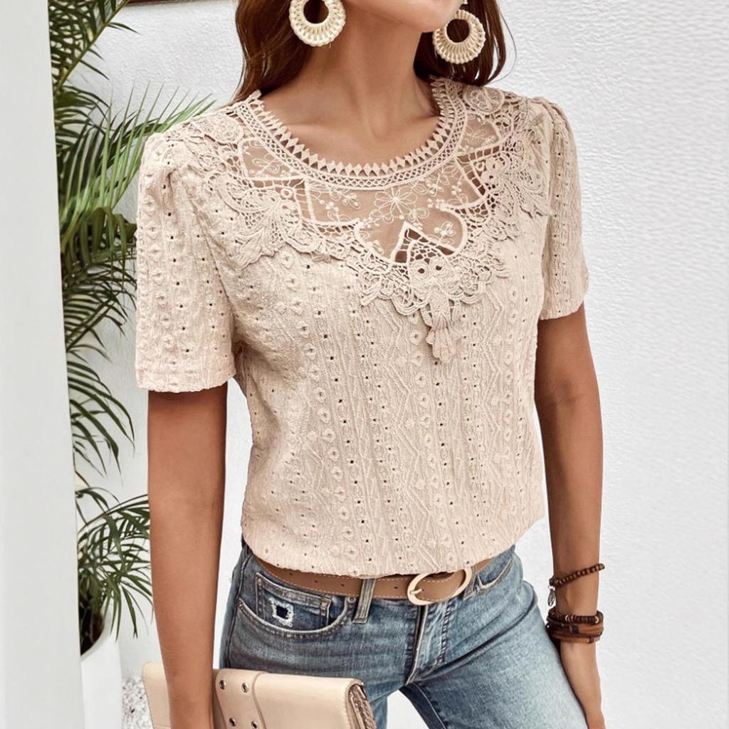 Летние кружевные лоскутные полые блузки и рубашки женские с круглым вырезом и короткими рукавами, однотонные