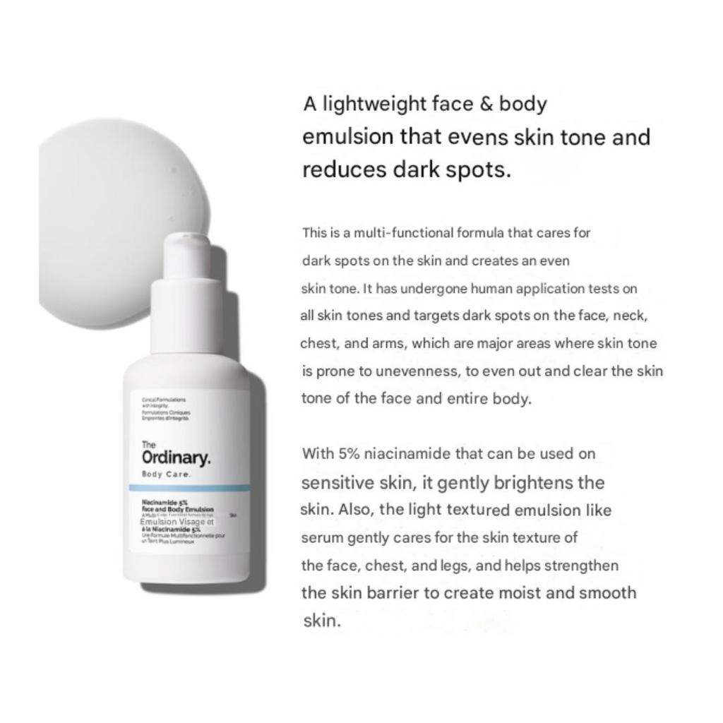 The Ordinary Ниацинамид 5% Эмульсия для лица и тела — это легкая многофункциональная эмульсия, предназначенная для выравнивания тона кожи и уменьшения видимости пигментных пятен..