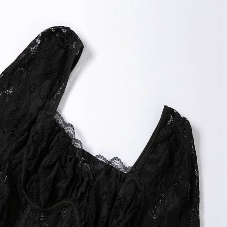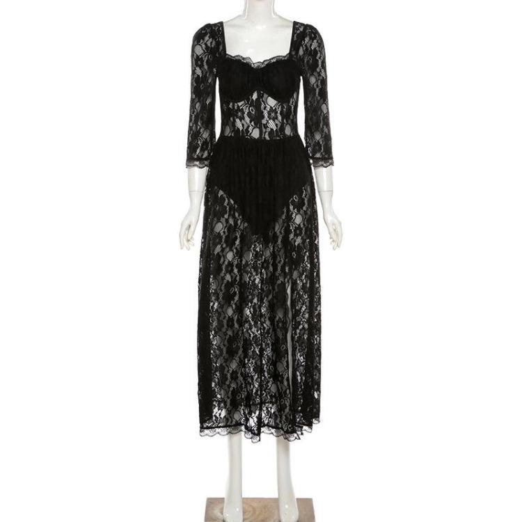 Сексуальное платье с открытой спиной, длинное, с разрезом, кружевное, для женщин, квадратный вырез, рукав три четверти, летнее однотонное платье
