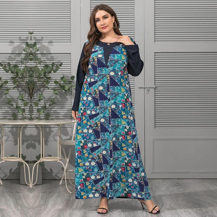 Элегантное женское платье большого размера свободного кроя с длинным рукавом Весна Лето Вырез лодочкой Принт Сшивание XL-4XL