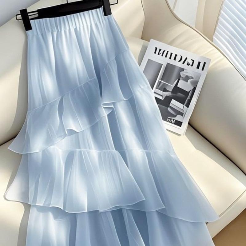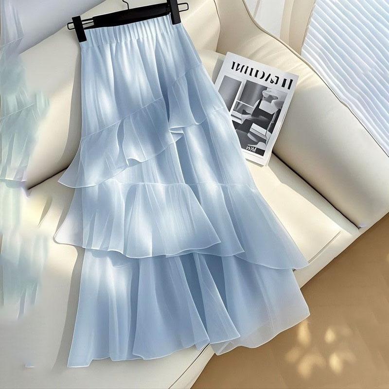 Женская уникальная красивая многоярусная юбка элегантная с высокой талией синяя шифоновая А-силуэта юбка-полусолнце