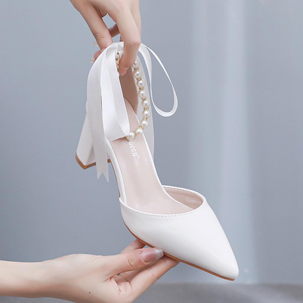 7 см толстый каблук остроносые босоножки ремешки для женских босоножек белые бисерные свадебные туфли невесты на высоком каблуке большого размера