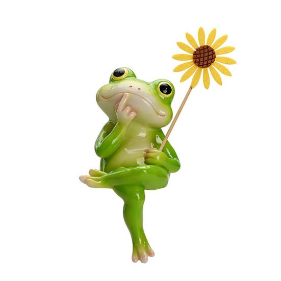 Украсьте свой сад этим очаровательным украшением в виде задумчивой лягушки, держащей подсолнух.. Изготовленное из высококачественной смолы, это прочное изделие устойчиво к погодным условиям и ультрафиолетовому излучению, что гарантирует его долговечную красоту..
